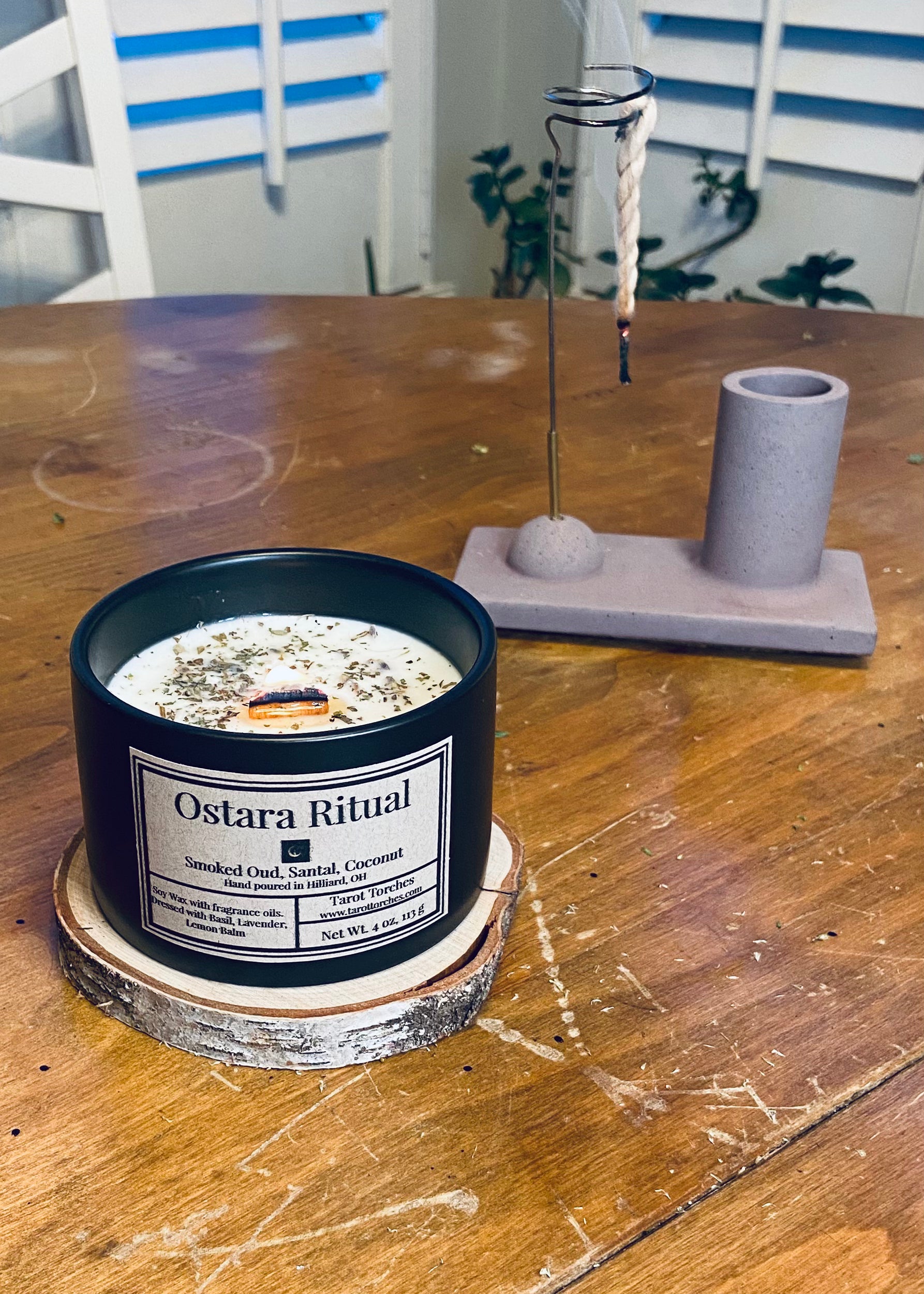 Ostara Ritual has notes of Smoked Oud, Santal, and Coconut, and is dressed with Basil, Lavender, and Lemon Balm. You will like this blend best if you are into earthy scents.